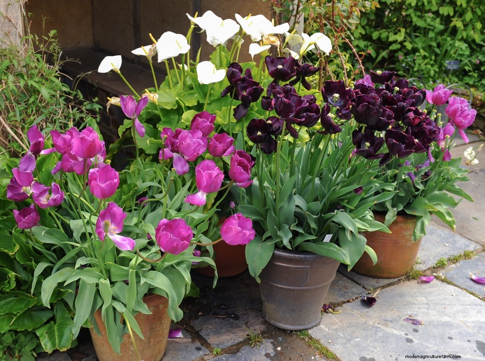 Pots of tulips are also useful as gap fillers in a spring bed or border. Either plunge the pot in to the soil to plug an empty spot, or on the soil if the existing shrubs and flowers are large and tall enough to disguise it.