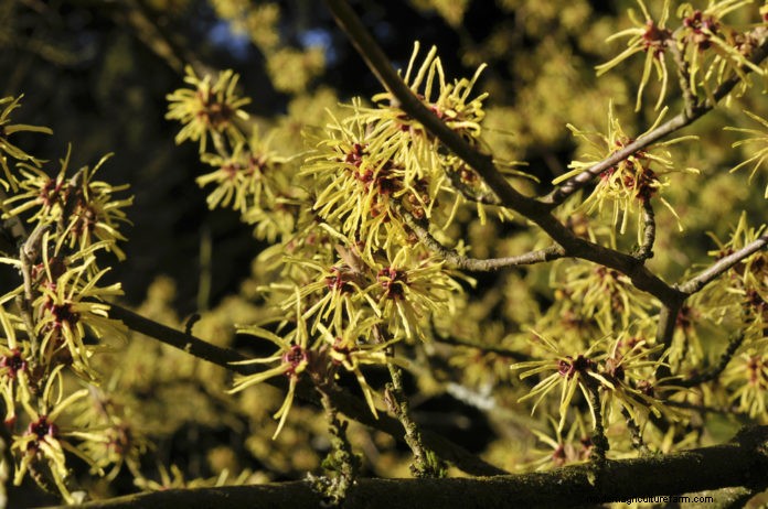 The intense colours displayed through the flowers of witch hazels in winter are a delightful mix of yellows, oranges and reds and the flowers defy the frost to stay intact once the weather warms up again.