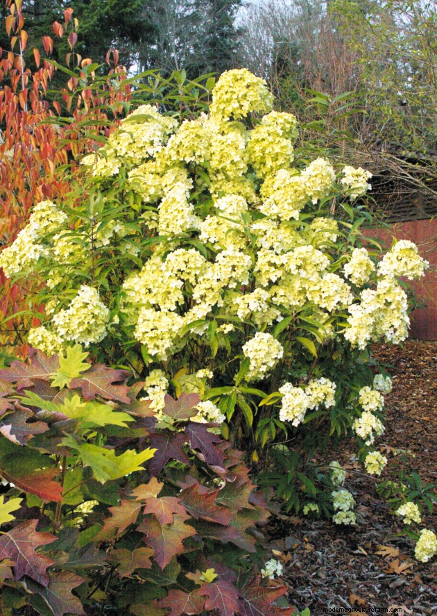 The latest of all hydrangeas to blossom, Hydrangea aspera subsp. strigosa, will look its finest during the first weeks of December. A particularly good form of this species, ‘Elegant Sound Pavilion’ is a naturally occurring, mutant mop-head form I found in Sichuan Province in 1996. By late November in my garden, at the base of this hydrangea, the first jewel-like flowers of Cyclamen coum and Galanthus reginae-olgae appear.