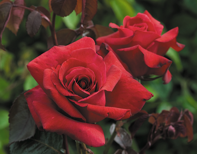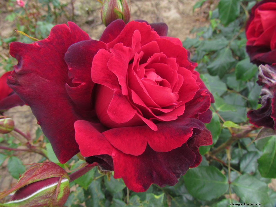 The most deliciously scented, deep-red rose, with soft and velvety petals. Buds are a dramatic black and are perfectly shaped before the blooms fully open. The gorgeous flowers are surrounded by attractive purple leaves.