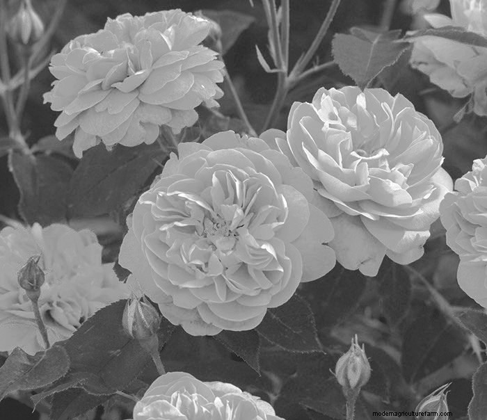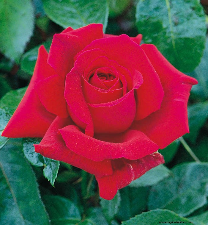 This is a superb red rose for the garden if you want to grows lots of rose bushes together in the garden to make a big display. It produces its velvety, scarlet red flowers in large clusters and has shiny/purply foliage.