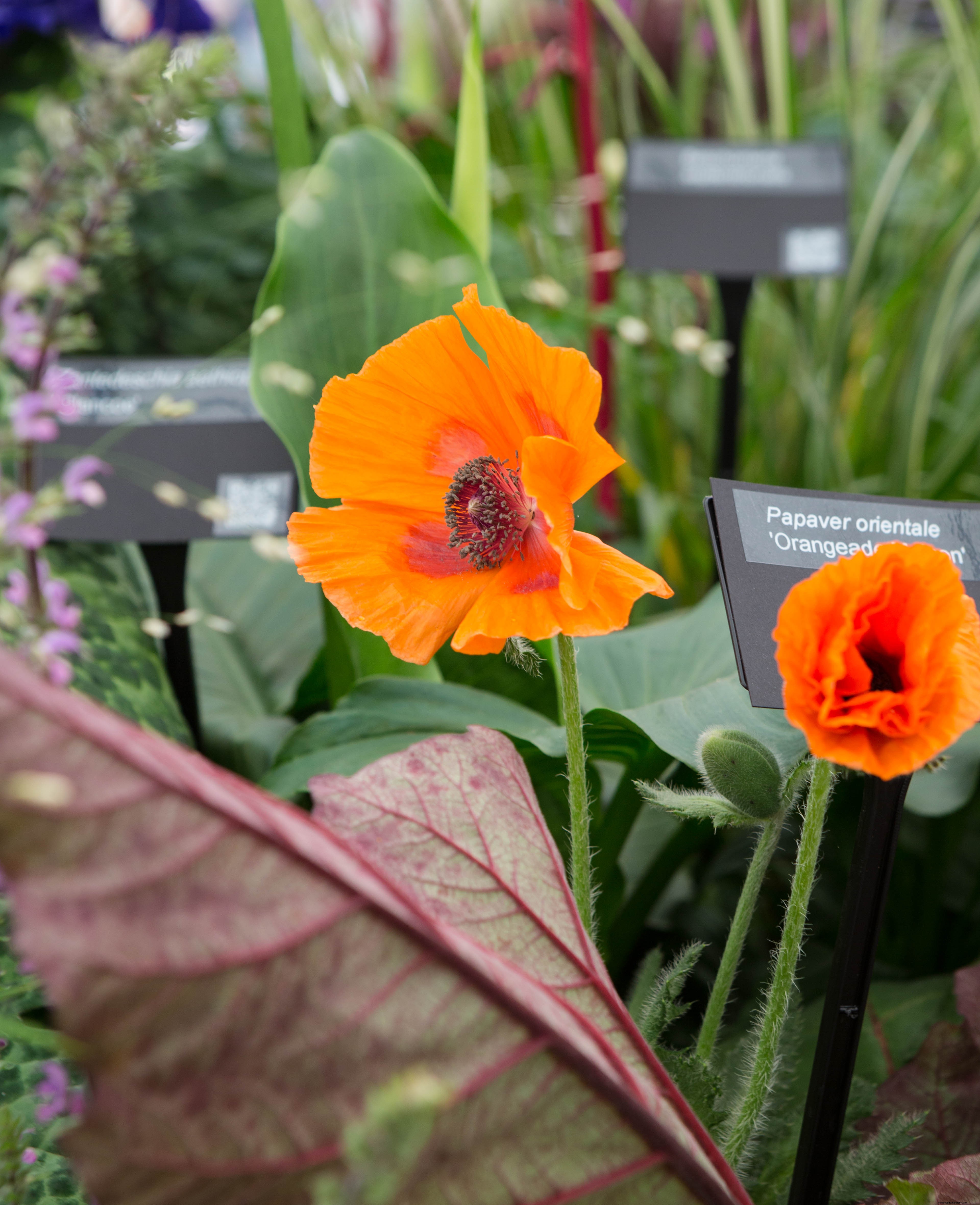 Many of the plants on display have been grown by Worcestershire branch members, who have been tending to them during the past year. QR codes enable visitors with smart phones to access lists of the planting, the theme of which is strong colour, and how to grow the plants. One plant that caught our eye was the stand-out poppy ‘Orangeade Maison’ – a relatively uncommon colour among poppies, a brighter orange would be hard to find.