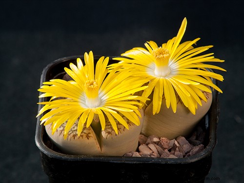 Also known as living stones, these are true miniatures that will never outgrow your home or collection. They are easy to care for provided you follow their specialist requirements: once they have finished flowering (September/October) you should withhold water and this will encourage the plant to grow some new leaves under the existing leaves. The old leaves will slowly shrivel to reveal the new bodies underneath. When the old leaves have fully dried up (May) you can water them as you would cacti, the new leaves will grow and in the autumn they will flower, in either white or yellow.