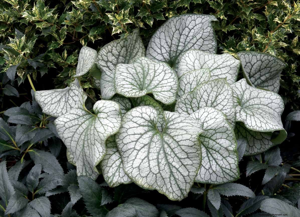 Plant 1: Brunnera ‘Alexander’s Great’ This variety has large, silvered leaves of good substance with big spikes of forget-me-not flowers and is zone 3 hardy.