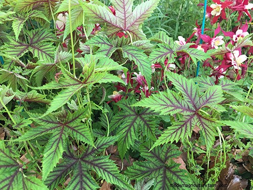 Unusual red-veined Filipendula multijuga ‘Hjordis’ cries out to be a partner in striking plant associations. Highlight its intricate leaf pattern by teaming it with matching red flowers, such as Aquilegia ‘Koralle’, as seen on the Hillview Hardy Plants’ silver-gilt winning exhibit. The Shropshire nursery advises giving it moist but well-drained soil and a position in dappled shade. They have plants on sale for £8.50 here.