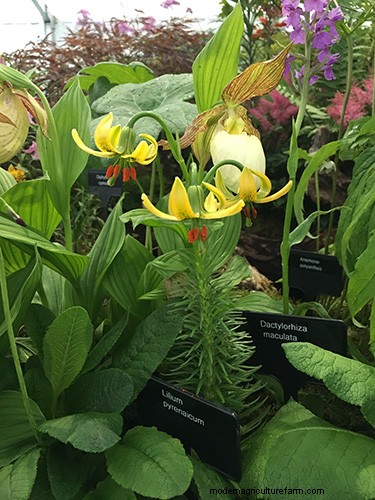 This beautiful combination of Digitalis Illumination ‘Raspberry’ with white button-flowered Ranunculus aconitifolius ‘Flore Pleno’ and Rodgersia aesculifolia was just one example of wonderful plant partnering on Harperley Hall Farm Nurseries’ stand. The County Durham based nursery also displayed sky blue Meconopsis, a range of beautiful candelabra primulas, slipper orchids and dainty lilies, like tiny Lilium pyrenaicum, on their gold medal winning stand.