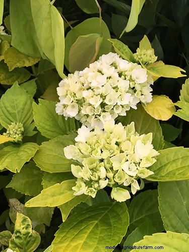 Another unusual Hydrangea caught the eye on Morton Nurseries’ silver-gilt medal-winning stand of summer shrubs and perennials. Hydrangea macrophylla ‘Jofloma’ has bright yellow-green foliage with flowers that start lime and open to white.