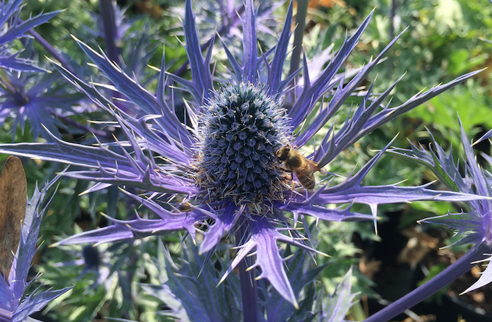 ‘Big Blue’ will form mounds of ice grey spiny leaves that are perfect for adding texture to a border. Large thistle-like flowerheads of cobalt blue sit above a ruff of silvery bracts that sit high above the foliage on thick blue tinted stems. It works brilliantly as a cut flower and dries well for longer lasting displays. For more eryngiums to grow, click here.