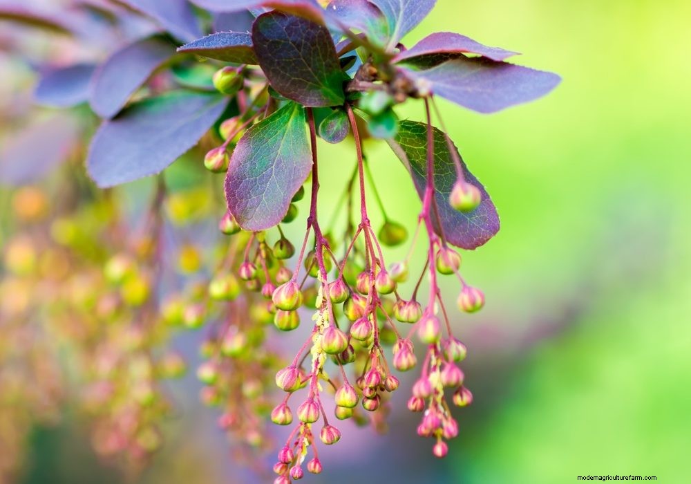 This deciduous species has reddish-purple leaves. The leaves on young shoots are pinker, giving a lovely effect when shrubs are outlined with fuzzy new growth. They also bear bright yellow blossom in summer and glossy red berries in autumn.