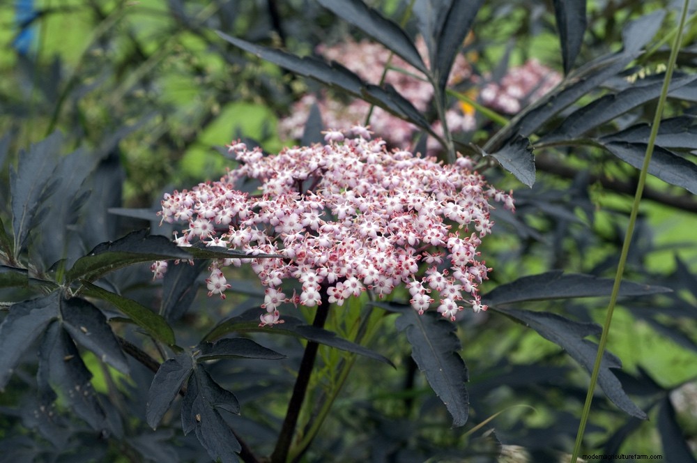 The black-leaved elder is more beautiful than the common elder that grows in the hedgerows. Its slim black foliage is the perfect background for showing off delicate, pink tinged elder flowers.