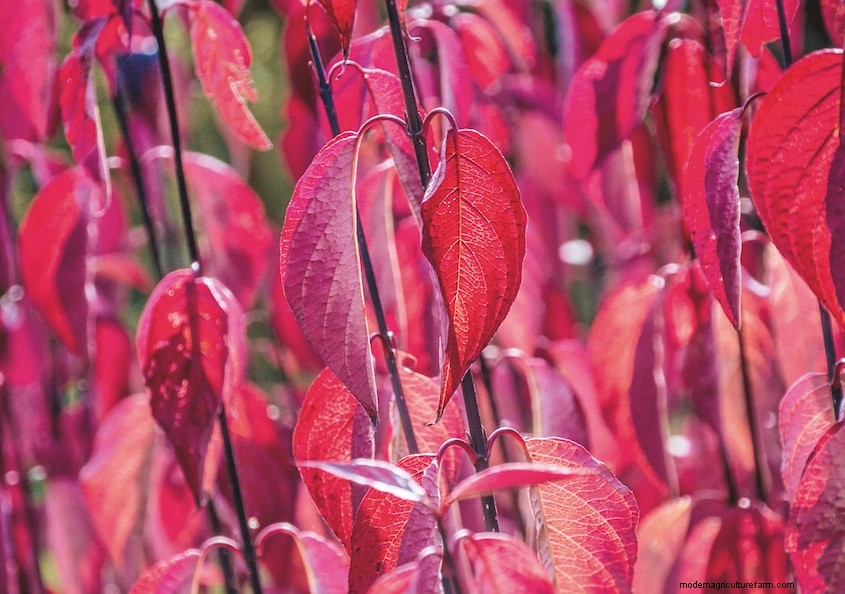 In autumn, their colour darkens and intensifies into red and purple shades – in contrast to clusters of white berries, if they’ve been produced – before falling and revealing the shrub’s dramatic stems, which become a darker purple-black in winter.