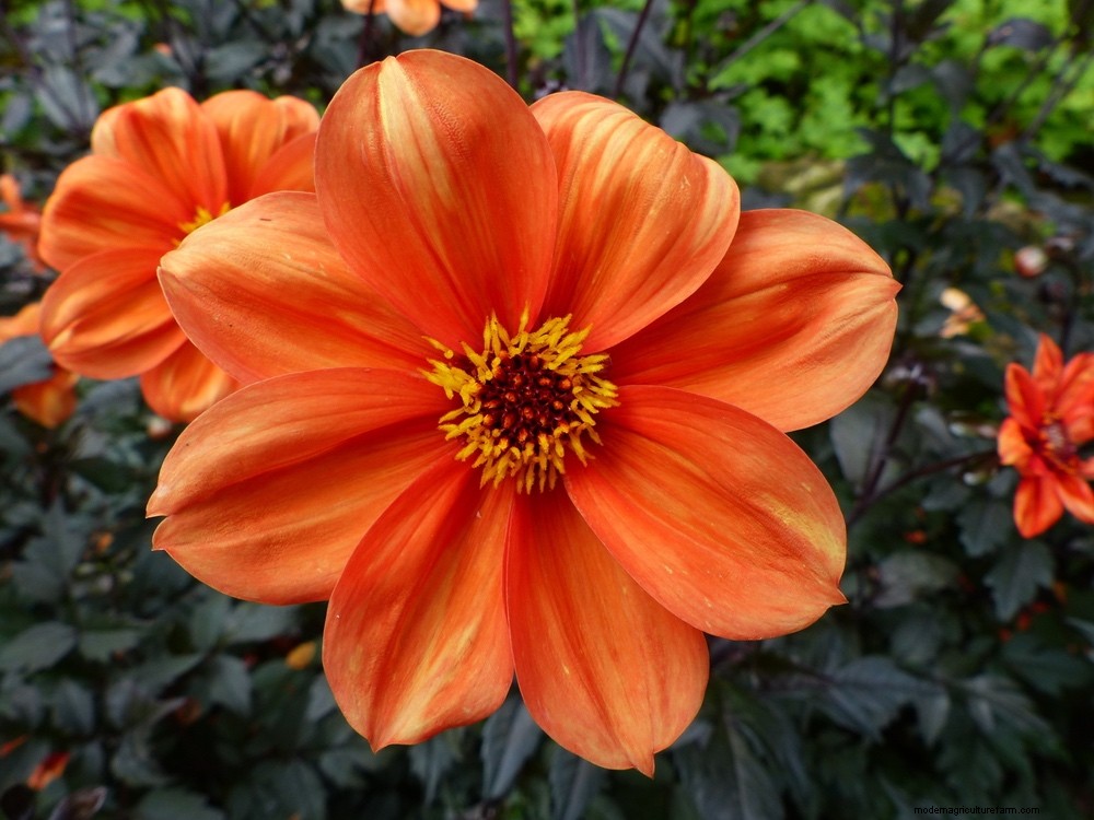 There’s something autumnal about the warm orange flowers that accompany the dark purple on dahlia ‘Bishop of Oxford’. It’s a truly unmissable plant to enjoy up until the first frosts of winter. It grows to around 90cm tall.
