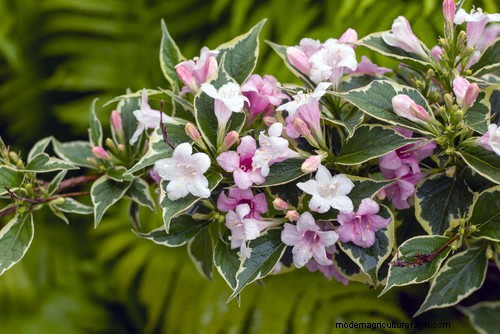 This is a very reliable and underrated garden shrub. It produces its trumpet-shaped flowers in spring and they last into summer. The variegated leaves have a lemon yellow edge and make an elegant foliage filler for cut flower displays. Reaching 2.5m tall, it is best planted at the back of a sunny border or by a wall. It will also grow well in partial shade.