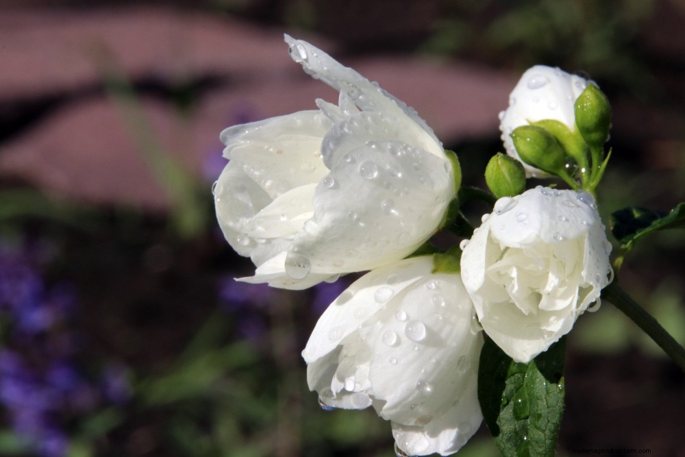 These late spring and early summer-flowering shrubs are highly scented and add an elegance and old-fashioned charm to the garden. They can be big shrubs, some growing over two metres wide. ‘Snowbelle’ is a more compact variety, growing to around a metre tall and wide. It is a free-flowering form, producing masses of double white flowers with a citrus perfume.