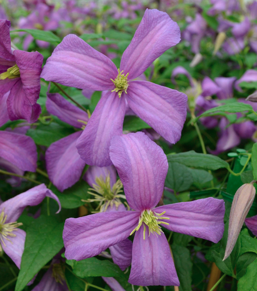 New for 2018 and an exceptional new viticella type clematis, producing beautiful pinky-lilac ‘katherine-wheel’ shaped flowers in great abundance and have pretty contrasting pale-yellow stamens. It is a very subtle colour and the plant flowers all the way up the stems. With a long flowering time of June-September it really is a very impressive new clematis. From: Thorncroft Clematis
