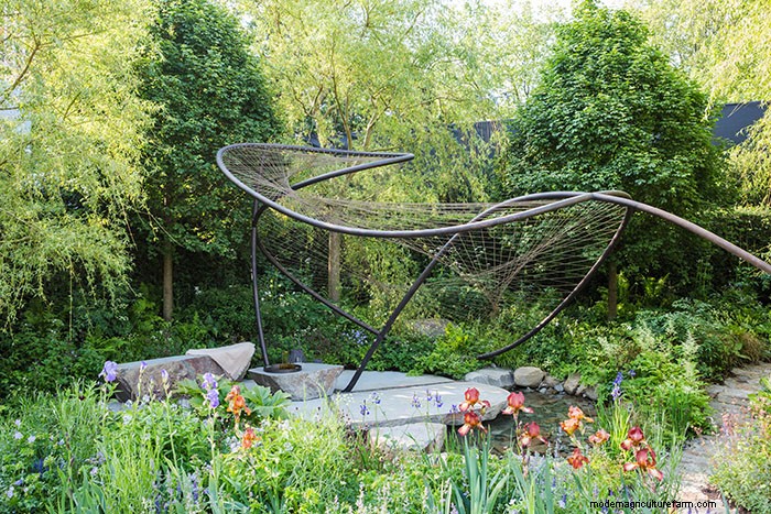 Jo Thompson’s Wedgwood Garden was designed with a strong, successful woman in mind, to fulfil Wedgwood’s brief of creating a garden that spoke of female innovation, ambition and luxury. Keen to avoid cliches of pink, the palette echoes that of Wedgwood’s ceramics, the pale blue and lemon of Jasperware, as well as rusty brown bearded irises that complemented the dark brown sinuous structure of steel and chains.