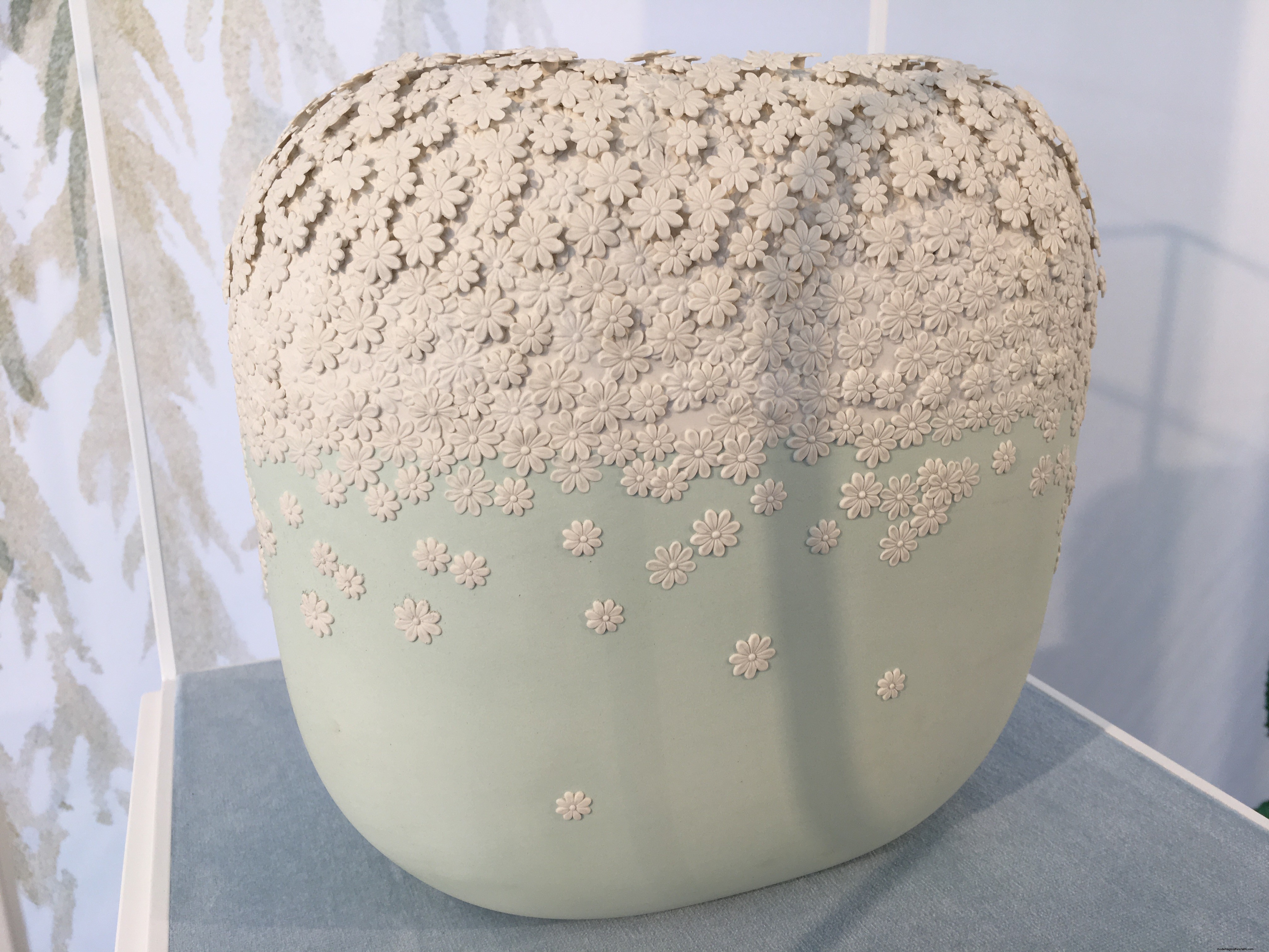 In the adjoining Wedgwood tea conservatory, the firm’s latest range were on display: beautiful creations by new Wedgwood Artist in Residence, Hitomi Hosono. Hosono, one of the UK’s leading ceramic artists, creates delicate work with porcelain leaves and flowers and has reimagined some of Wedgwood’s classic pieces with hand-applied flowers and filigree leaves in exclusive limited editions. The Kasumi Vase has 1,900 individual flowers embellishing its clean, simple lines.