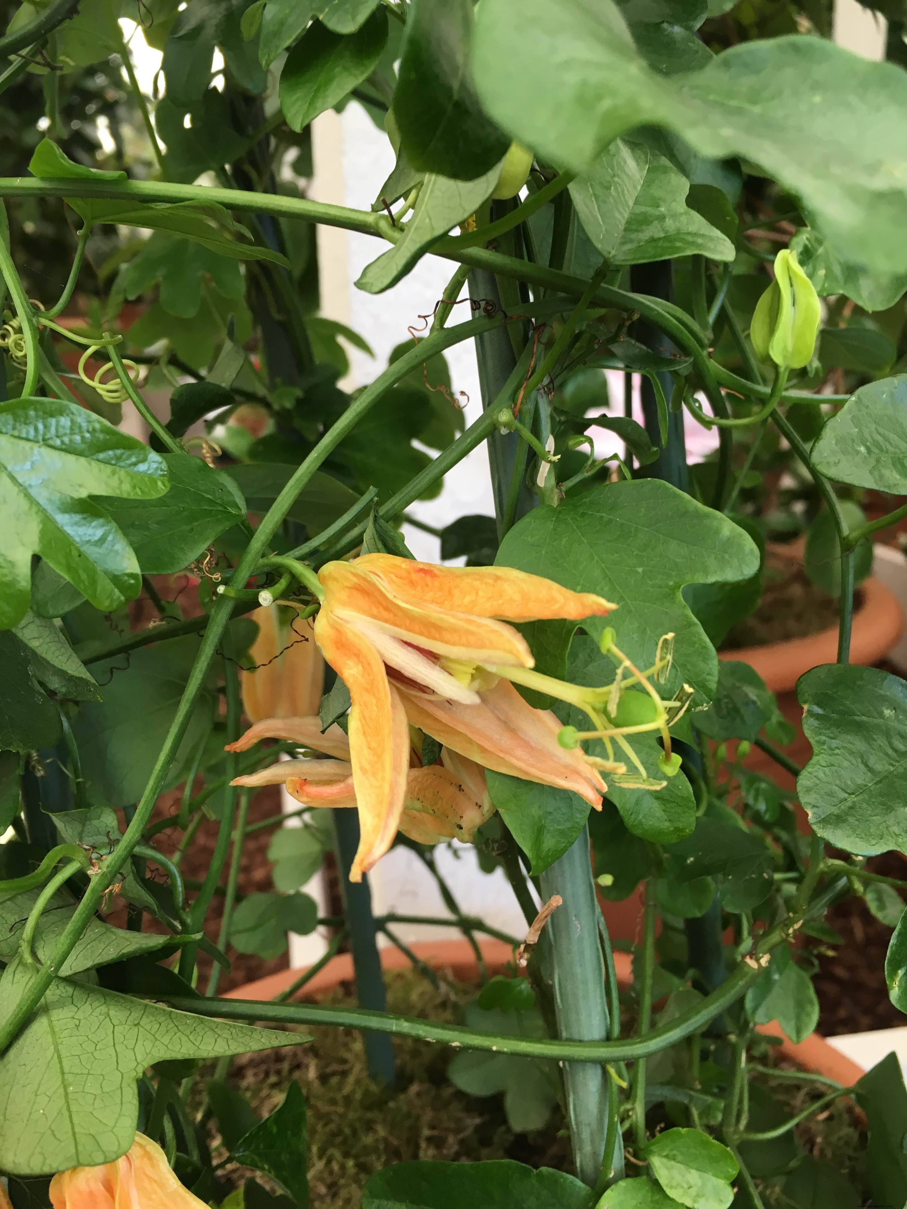 Finally, among the climbing plants on Tynings Climbers‘ exhibit was this orange peel coloured passionflower, Passiflora aurantia. it’s not hardy so best suited to conservatory or greenhouse growing, where temperatures don’t drop below zero, but the flowers are a beautiful shade of salmon-orange, deepening in colour as they age.