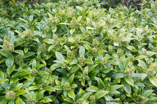 This is a low maintenance evergreen shrub, which has glossy green leaves throughout the year. In spring (April to May) it also produces clusters of creamy white flowers, which open from greenish-white buds and smell lovely.