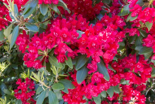 This dwarf variety of rhododendron is very hardy. It has distinctive, slightly twisted dark green leaves and in spring (April to May), produces abundant deep, waxy-red flowers, which bees love.