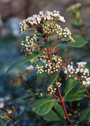 Also known as laurustinus, this evergreen shrub has neat, dark green foliage and heads of pink buds, which open sporadically to white flowers throughout winter and spring (December to April), providing early and late nectar for bees. These are sometimes followed by blue-black berries.