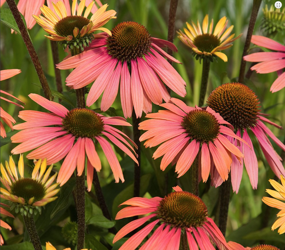 The pretty “ombré” coneflowers flower between June and September, dying back in autumn until their new growth the following spring. Comfortable in a sunny position in most soils.