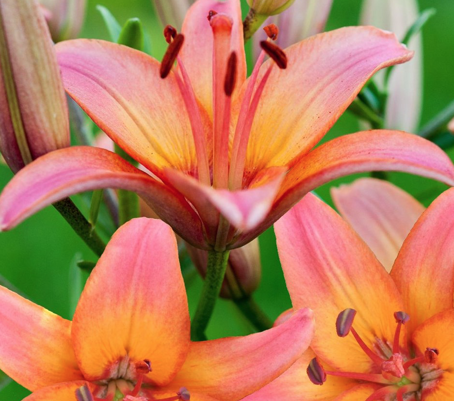 These tropical asiatic hybrids flower in late summer when kept in full sun and well-drained soil, enriched with leaf mould or a loam-based potting compost.