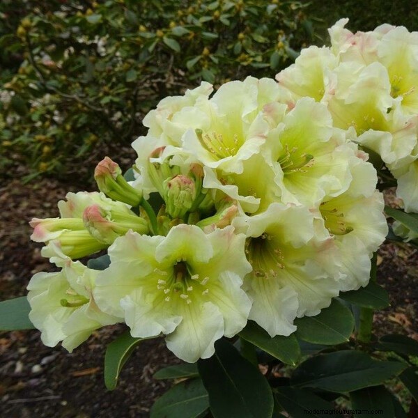 These light green-yellow flowers are a flushed yellow-pink at the edges with a deep yellow centre. The flowers sit in a neat rounded truss above a compact plant with good foliage. It grows to between 100–125cm in 10 years and requires moist, acidic soil. It’s perfect for the smaller garden, having a compact habit and flowering profusely from a young age. From: Millais Nurseries