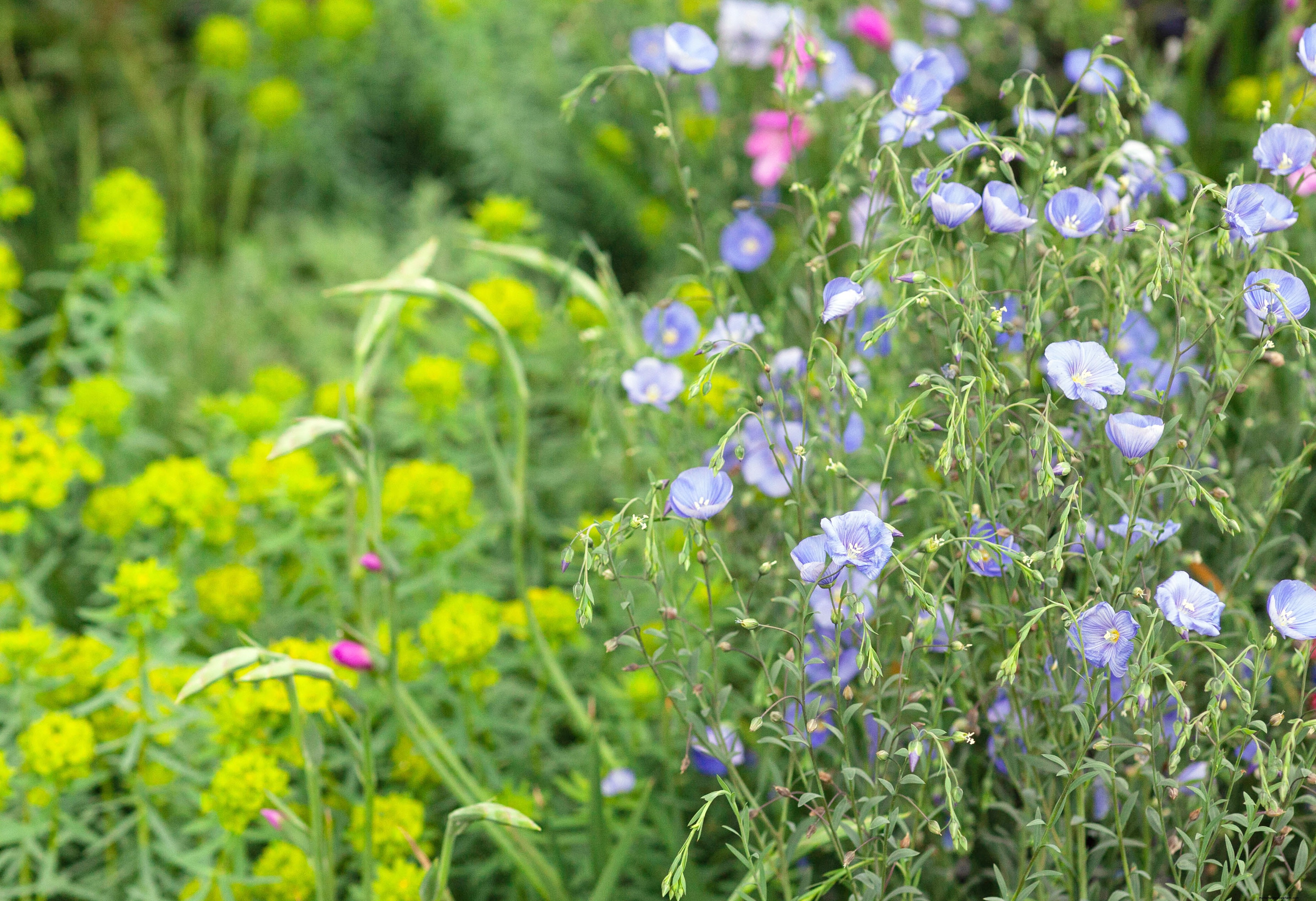 Balance cups of purest blue Linum perenne (perennial flax) with acid green bracts of Euphorbia seguieriana subsp. Niciciana, as Sarah Eberle did for the Forestry Commisison. Then try orange-toned Geum ‘Firestorm’ and Geum ‘Princess Juliana’. Include feathery forms of Eschscholzia such as ‘Copper Pot’, ‘Copper Swirl’, ‘Ivory Castle’ and ‘Mikado’.