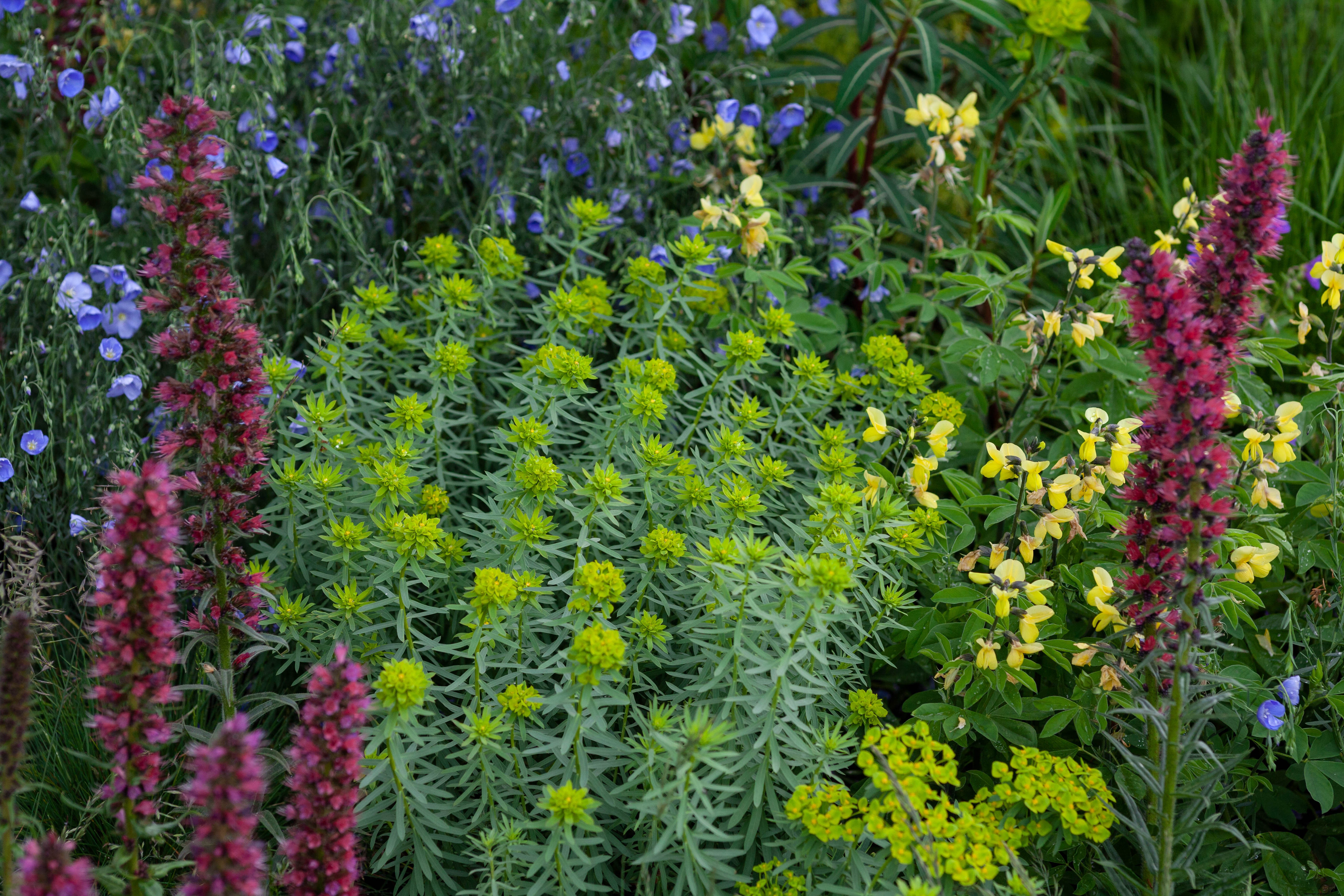Acid green and butter yellow Thermopsis chinensis are a low-growing accent for raspberry-coloured spikes of Echium russicum. Also known as red-flowered viper’s grass, Echium russicum is a biennial or short-lived perennial that grows best in full sun, where it will provide spikes of flowers throughout summer.