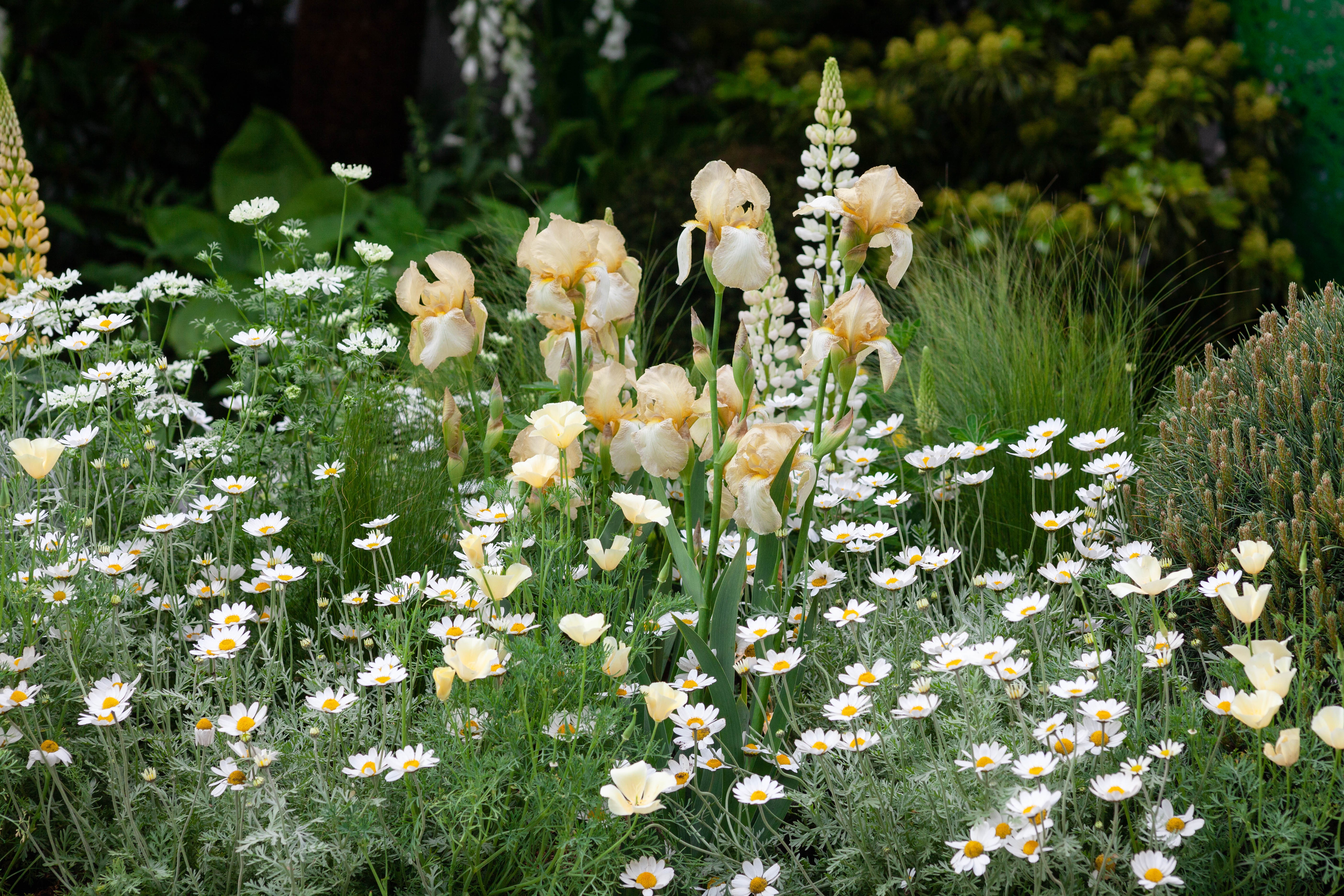 All-green arrangements are a classic scheme. For the charity Greenfiners, Kate Gould used softening drifts of white, butter-yellow and occasional bursts of saffron. The bearded Iris ‘Benton Primrose’ and the cheerful creamy-yellow lupin ‘Gallery Yellow’ bring a vertical element to swathes of daisies. Other plants that work in this scheme include the peony ‘White Emperor’, a semi-double with deep white cups and yellow stamens, Aquilegia ‘Yellow Queen’ and Anemone ‘Wild Swan’, which won RHS Plant of the Year in 2011.