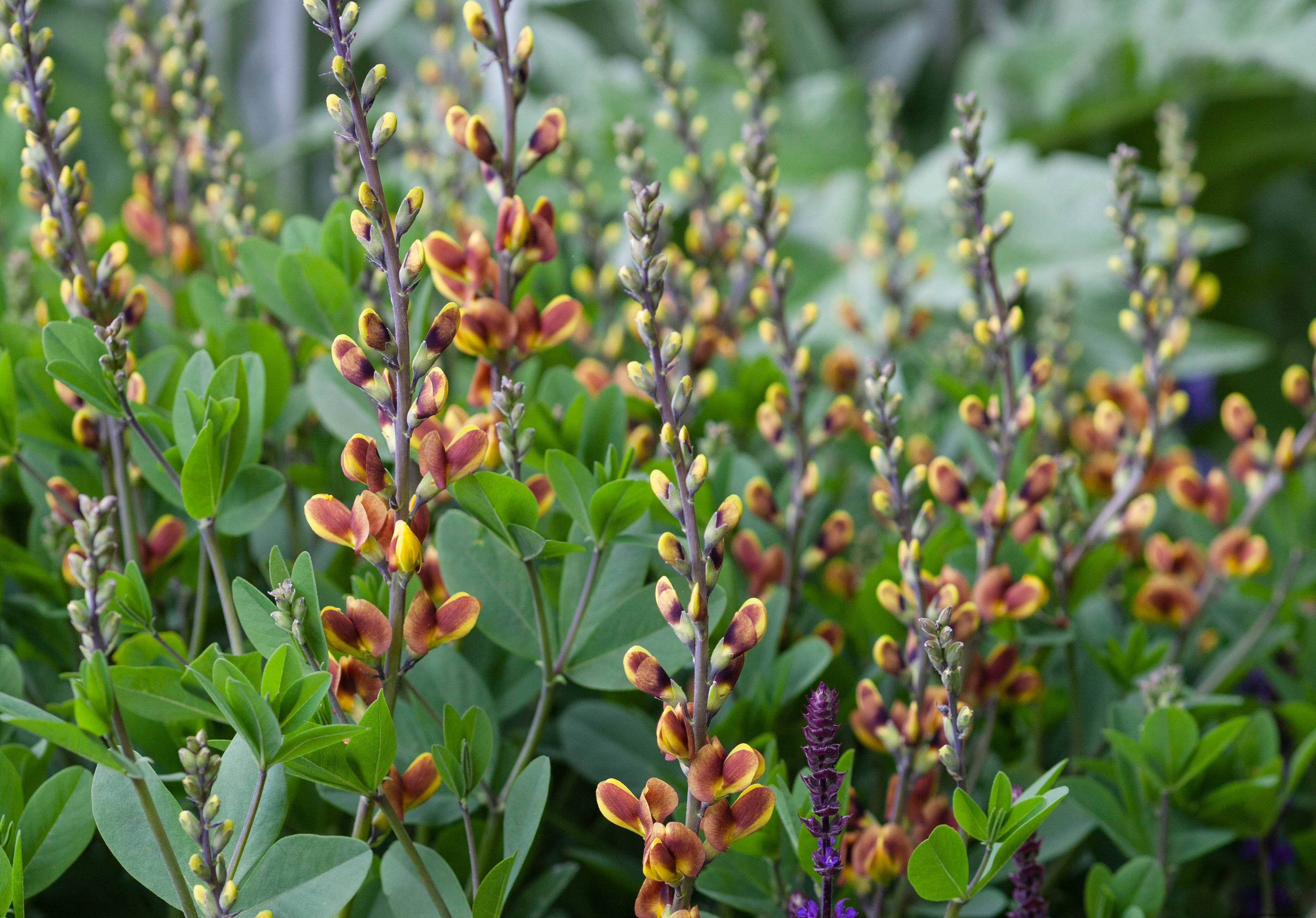 For a statement try Baptisia ‘Cherries Jubilee’, with unusual yellow and bronze flowers that extend along curved wands. Try growing this alongside Salvia nemorosa.