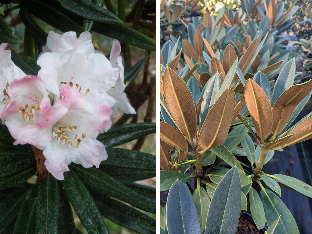 Rhododendrons like a constant, regular supply of water in free draining soil to mimic their natural Himalayan habitat. When growing them in the UK, it’s important to remember that unpredictable weather patterns can lead to water logging, even in mature plants. Something as simple as digging a small ditch around the roots can help an unhappy plant.