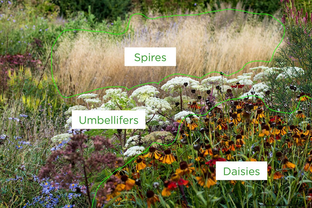 Tracing paper, or the black and white photo technique, can also help identify areas where a different flower form might be needed. Take a leaf from Piet Oudolf’s book and think about putting plants together from these three groups, determined by the basic shapes of their flowers: