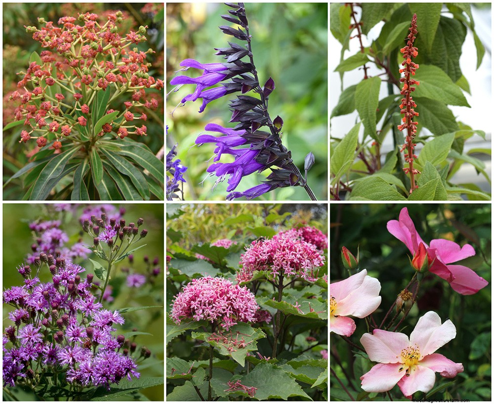 - Vernonia arkansana ‘Mammuth’ – a beast of a plant that reaches 1.9m with clusters of fluffy purple pink flowers