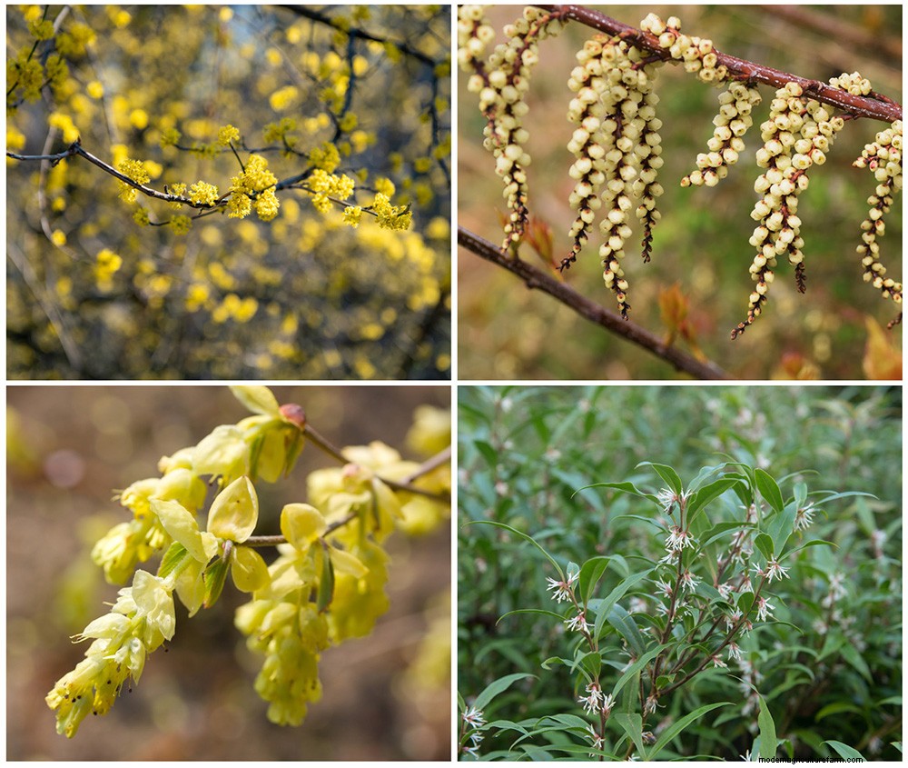 - Stachyurus praecox with stiffly dangling threads of bell-shaped pale yellow flowers