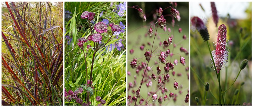 - Astrantia major ‘Claret’ has deep, ruby-red flowers that look like pincushions, and works really well in a modern prairie setting