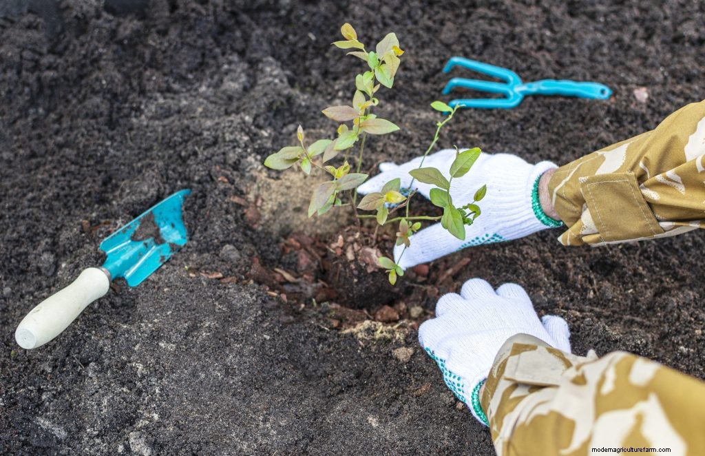 You should never cultivate or dig around the top of the blueberry plant’s root zone to “rake in” granulated fertilizers because blueberry roots grow shallow. For blueberries, simply apply granulated fertilizer as a top-dressing and water it thoroughly.