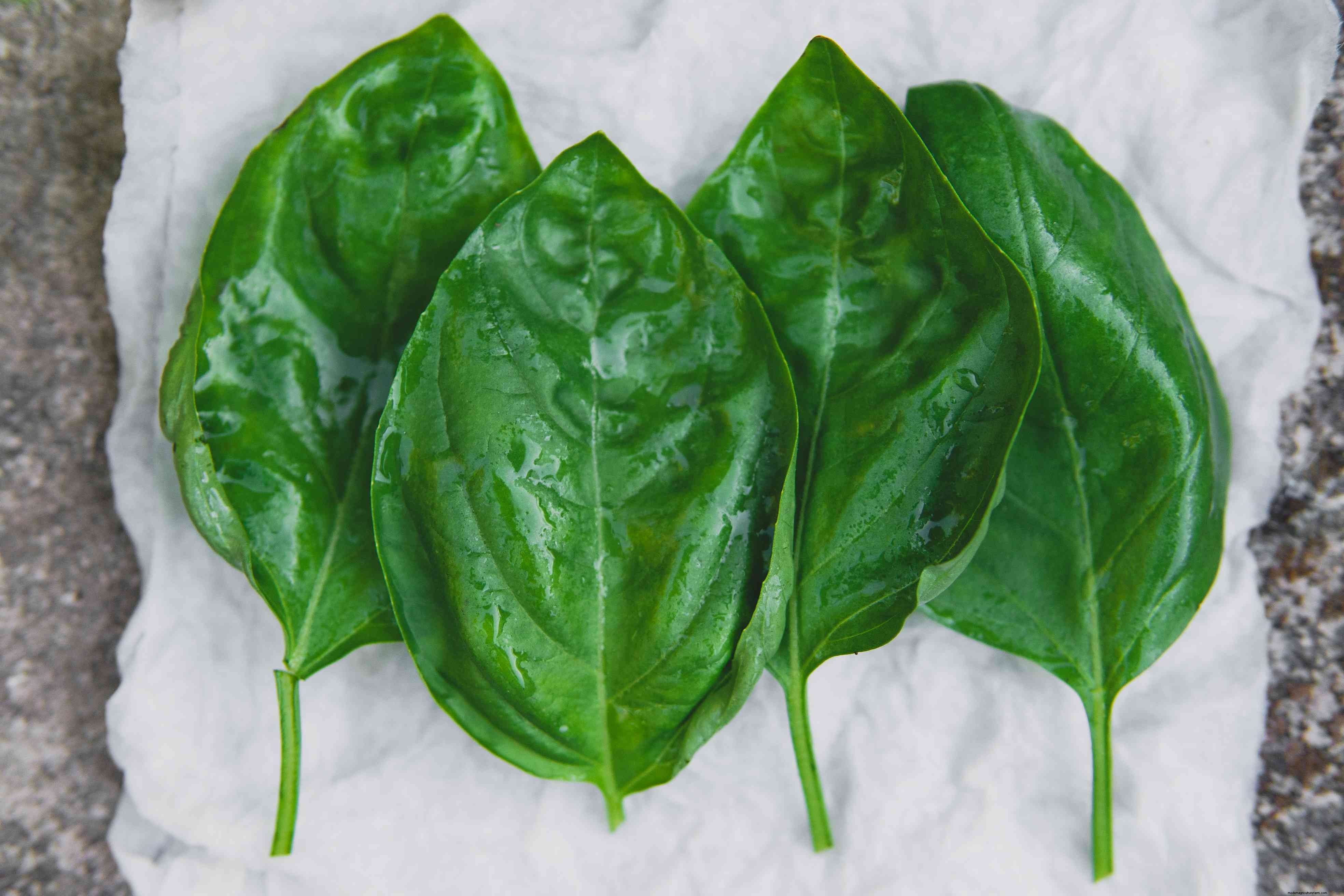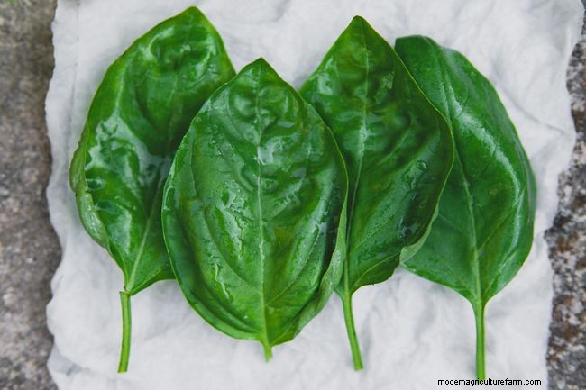 After you’ve harvested basil, remove the leaves from the stems. Throw away any leaves that have spots or don’t look healthy. Rinse leaves thoroughly and let them air dry or pat them dry.