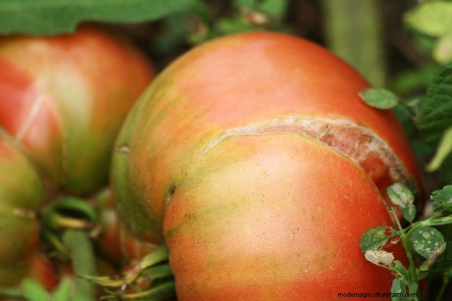 Like the foliage that’s dying back, splitting tomato fruit is a sign of uneven watering. If the plant receives too much water while the fruit is ripening, the skin will split because the fruit’s skin can no longer expand.