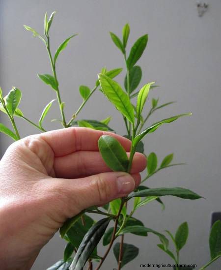 How to make tea: Heat the leaves before they have a chance to oxidize (dehydrate). To heat the leaves, steam them for 1 to 2 minutes and then immediately run cold tap water over them to stop the heating process and to retain the green color. Then roll the leaves, which will be soft and flexible, with your hands or with a sushi-rolling mat into tubes. Immediately after all the leaves are rolled, spread them in a dish and place them in an oven preheated to 212-230 degrees F for 10 to 12 minutes, turning them after five minutes to ensure even drying. The heating process is finished when the leaves are totally dry and crispy. Store them in a sealed glass container.