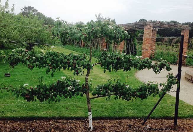 The idea, he explains, is to remove buds that are not facing in the direction of your supports and to permit the buds facing in desired directions to develop into shoots. If you're creating a tiered or horizontal T-shape, you will want to keep a central leader. If you are creating a fan shape, you will want to prune off the leader to force out two main side branches that will form the base of the fan.