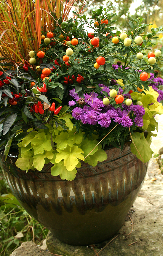 In this container combination a yellow heuchera, ornamental grass, and purple chrysanthemum are combined with an ornamental pepper. The ornamental pepper can be brought indoors and treated as a houseplants (provided you have enough light) and used again the following year.