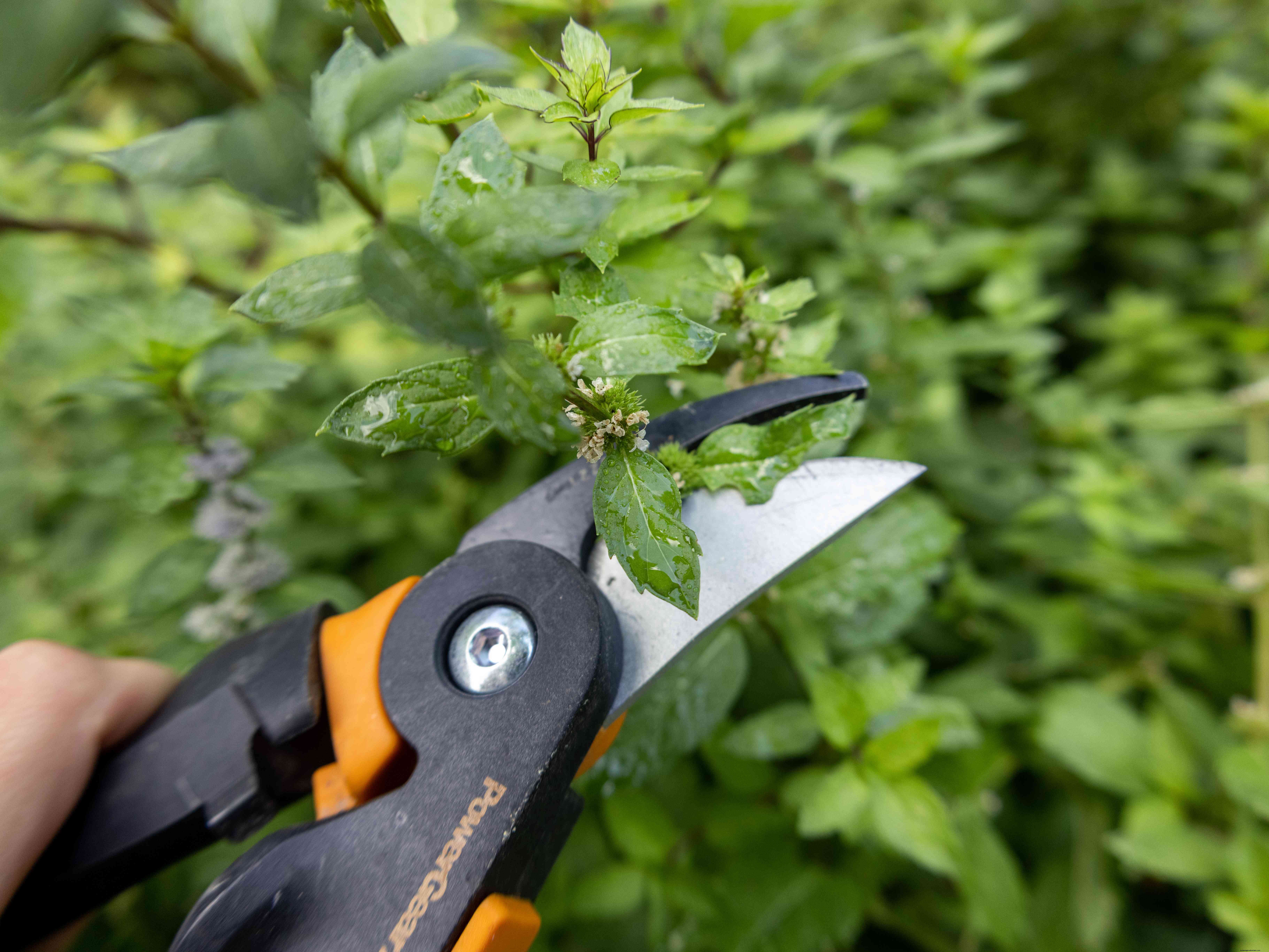 Mint is a wonderful cut-and-come-again plant. Snip just above a node, and the plant will branch out from there. However, for the best oil content, try to harvest when the plant is in full bloom and in the late morning once dew has dried on a sunny day.