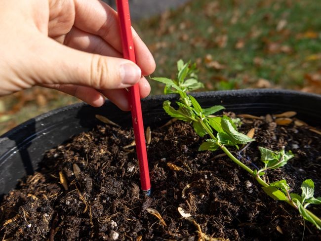 Mint spreads fiercely through gardens via its roots or stolons. It is hardy enough to sprout roots from a cutting in a glass of water. Just trim off all but the top few pairs of leaves and wait a week or so. To plant cuttings directly in the soil, you can use a rooting hormone. Again, trim all but the top leaves, then dip the stem in the powder or liquid. Make a hole in the soil with a pencil, insert the stem gently, and close the soil around it.