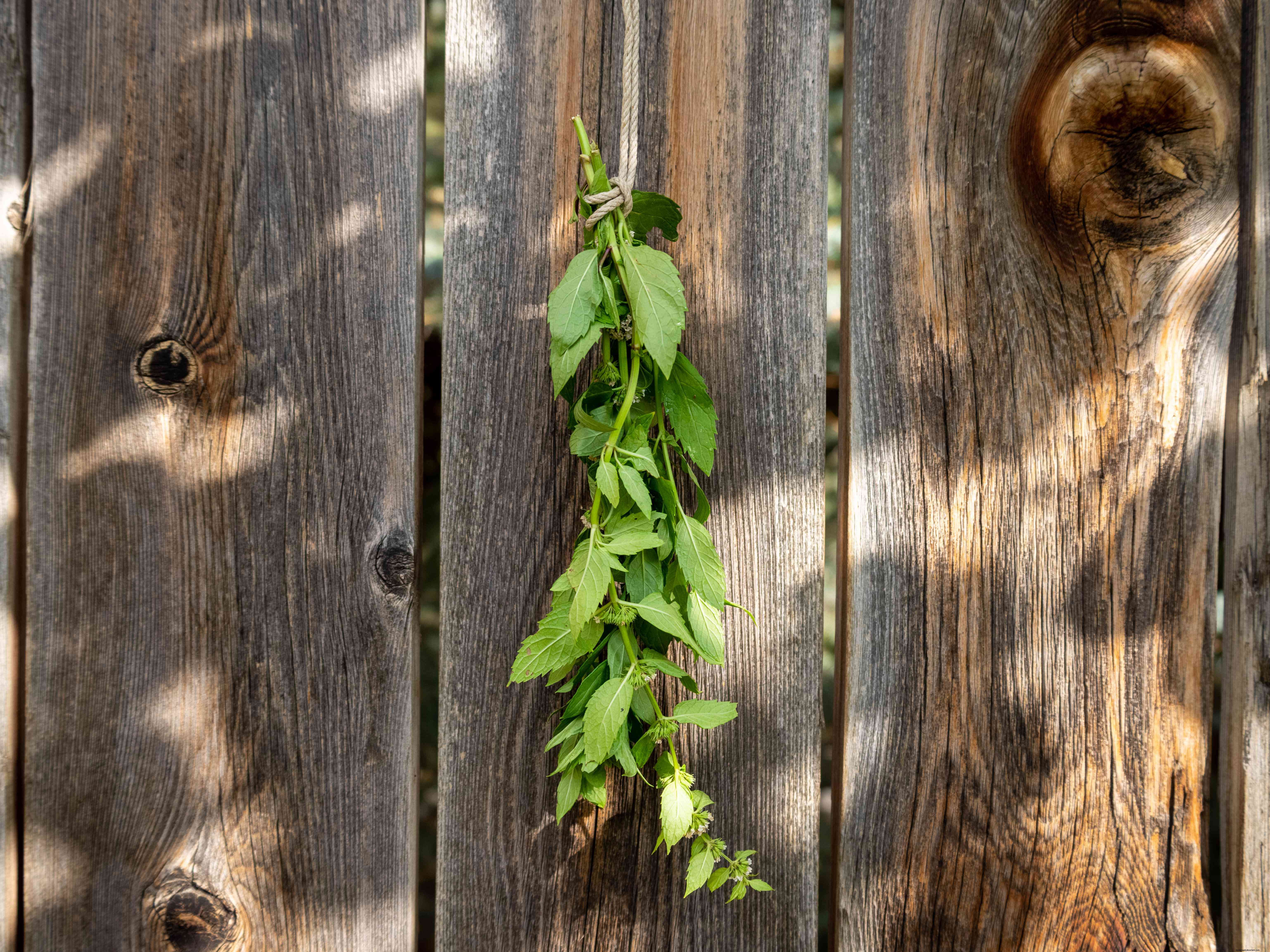 Mint can be used fresh or dried. To dry mint, simply tie up a small bundle and hang it upside down in a place with good air circulation and no direct sunlight. Once it's dry, crumble it into a glass jar, removing the thick stems. Use as you would any loose tea or herb. The National Gardening Association recommends cutting 6-inch stems, tying them together and putting the bunch into a paper bag to maintain a nice color, and then hanging the mint in a well-ventilated area.