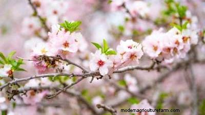 Almonds are not self-fruitful. Pollen must come from a different almond cultivar. Peaches may be a suitable pollen source for almonds. However, almonds tend to flower earlier than peaches, but if almond and peach flowering coincide, peach can provide pollen to almonds. Insects are required for cross-pollination. Honeybees are the most common pollinator.