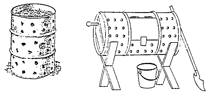 Barrel It (good for limited space, easy turning, moderate to high cost) If you don’t have enough space for piles or elaborate bins, a modified 55-gallon drum can work very well. By perforating the drum with air holes and cutting an access hatch on the side you can create a system which will compost small amounts of material quickly. Usually these systems are equipped with a stand and rollers to facilitate turning, although some people just roll their barrel around the yard to achieve the same effect.