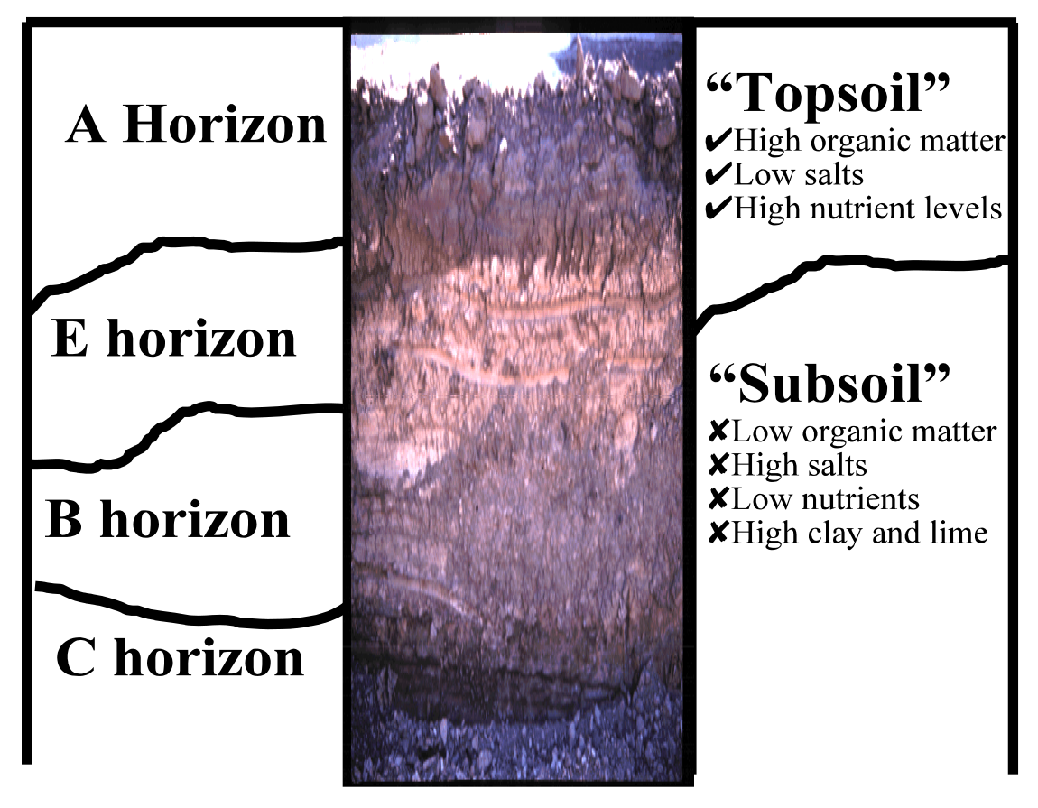 Soil is divided into horizontal layers called horizons (Figure 1). The surface layer - the A horizon - is usually darker than the subsurface layers - the E, B and C horizons. Organic matter gives the A horizon its characteristic dark color while enhancing desirable physical properties such as tilth (ease of tillage), structure, water infiltration, and water-holding capacity. Topsoil is defined as the A horizon only, while the E, B and C horizons compose the subsoil. Subsoil horizons have higher levels of clay, salts and lime than topsoil. These properties make subsoils poor substitutes for topsoils.