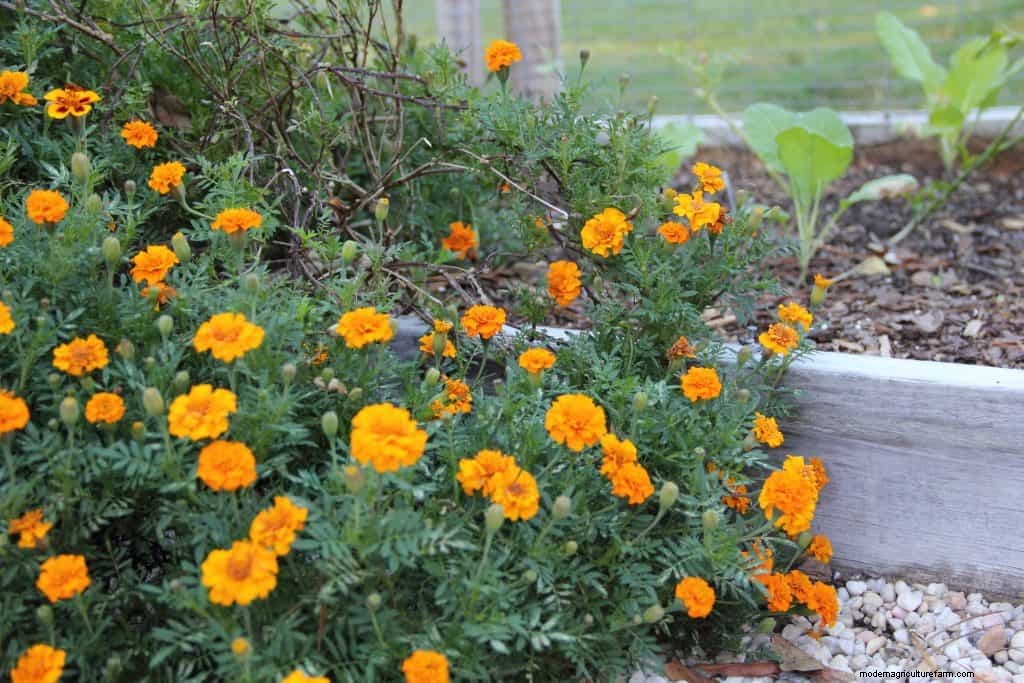 The marigolds we planted in the spring that grew mammoth-size are also still going strong. Those two little marigold plants have taken over four squares in the raised bed, and half of the walkway. (And I’ve even cut some back.) And the marigolds are still working hard at keeping some garden pests away!